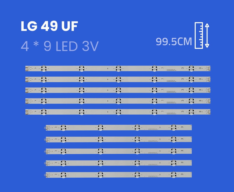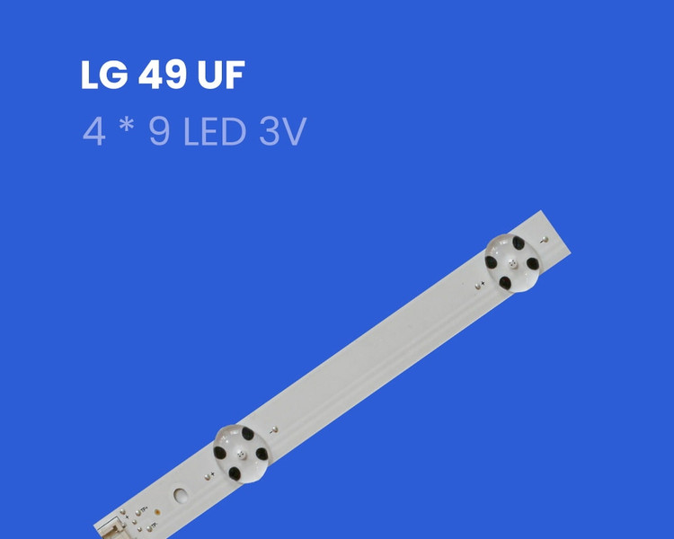 این بک لایت مناسب تلویزیون 49 اینچ LG سری های 49UF و 49LF و 49LH و 49LJ می باشد. این بک لایت شامل 4 خط ال ای دی به طول 99 سانتیمتر می باشد. هر شاخه دارای 9 ال ای دی می باشد. هر ال ای دی 3 ولت می باشد.