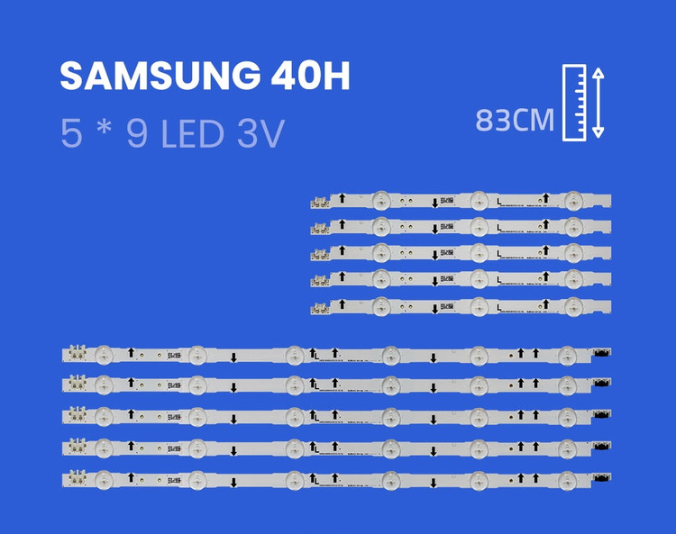 این بک لایت مناسب تلویزیون های 40 اینچ Samsung سری 40H, 40J می باشد. شامل 5 خط ال ای دی به طول 83.5 سانتیمتر می باشد. هر شاخه دارای 9 ال ای دی و 3 ولت می باشد.